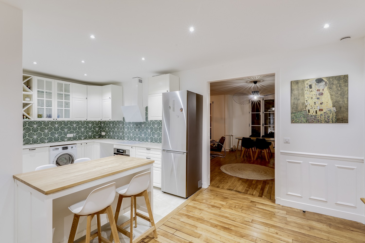 Square de Port Royal Rénovation d’un appartement classique du 13ème arrondissement de Paris Nous avons rénové intégralement un appartement à Paris dans le 13ème arrondissement. Cet appartement n’est pas de type haussmannien, mais néanmoins très classique à Paris, dans le style typique des immeubles des années 30 années 30. Notre intervention consistait à effectuer les travaux de rénovation d’un bel espace familial classique de 115m² qui a été acquis “dans son jus” par ses nouveaux propriétaires. La rénovation classique de cet appartement a eu lieu dans l’ouest du 13ème arrondissement, square du Port Royal, en limite du 5ème arrondissement, dans le quartier du Val de Grace, de l’hôpital Cochin, du haut boulevard Saint Michel… L’appartement n’avait pas été rénové depuis des décennies, nous avons aidé ses acquéreurs à se projeter en travaillant avec eux, sans architecte, dès la signature du compromis. Les travaux ont commencé après la signature de l’achat, nous avions annoncé 4 mois de travaux, promesse tenue. C’était la durée nécessaire pour mener des travaux de rénovation complets, tous corps d’état confondus. Objectifs et problématiques du projet Port Royal Cet appartement parisien était déjà un appartement familial mais dont la conception, les équipements, et la décoration dataient de plusieurs décennies. L’objectif de la rénovation était de remodeler l’appartement en profondeur en changeant l’usage des pièces, en ouvrant la cuisine, en créant une salle de bains dans un ancien bureau, en déplaçant les WC… Le Projet Port Royal en images : Les Étapes de la rénovation de l’appartement Port Royal Avant d’attaquer la phase travaux, nous avons organisé plusieurs réunions de travail avec les propriétaires pour faire les choix nécessaires en termes de volumes et de circulations… Une ultime version de devis après cette phase de conception nous a permis de démarrer les travaux. SQUARE RENOVATION, l’entreprise de rénovation d’appartement à Paris est ensuite intervenue pour la réalisation des lots techniques et architecturaux : curage-démolition, maçonnerie, plâtrerie, électricité, plomberie, peinture, menuiseries intérieures et extérieures… Le curage. La rénovation lourde de cet appartement sur Paris a commencé par une importante phase de curage. Les cloisons démolies, les sols, les revetements… ont été mis en sac et évacués. Cette étape permet de faire place nette et de confirmer les hypothèses prises en phase de conception. Une fois le mobilier et les cloisons évacués nous avons tracé les futures implantations. Les réseaux En rénovation d’appartement, le terme réseaux regroupe principalement la plomberie, le chauffage et l’électricité qui cheminent à travers les lieux. Le réseau électrique dessert les différents points (prises et éclairage) depuis le tableau électrique. Le réseau de plomberie, en cuivre en l’occurrence, chemine depuis l’arrivée d’eau de l’appartement vers les pièces humides : cuisine, salles de bains, WC. Ces réseaux circulent en encastré, de façon invisible, dans des saignées, des faux plafonds ou dans les sols. Le chauffage. L’appartement dispose d’un chauffage central comme c’est souvent le cas dans les immeubles de cette époque. L’opération de s’est pas déroulé en période de chauffe, il n’a donc pas été nécessaire de couper le chauffage et de purger le système de tout l’immeuble. La plupart des radiateurs ont été conservés, le réseau a été légèrement adapté à la future configuration des volumes, et nous en avons profité pour ajouter un sèche serviette à eau. Les revêtements. Le sol de l’appartement est revêtu d’un parquet que nous avons rénové par ponçage et vitrification. Les pièces humides ont été revêtues de carrelage et faïence choisis par nos clients chez nos fournisseurs partenaires. Rénovation de l’appartement Port Royal : le témoignage du client “ Notre appartement a été rénové par square rénovation. L’équipe est sérieuse, professionnelle, disponible. Le chantier a été livré en temps et en heure. Le résultat est exactement comme je l’avais imaginé. Mention spéciale pour Domitille qui a conduit le chantier avec passion écoute et gentillesse. Bref merci pour ce très bel appartement!! ” Monsieur et Madame S., acquéreurs d’un appartement parisien Les acteurs de la rénovation de l’appartement Port Royal Square Rénovation a accompagné son client dans son projet de rénovation d’appartement à Paris 13 du début à la fin. Toute l’équipe de Square rénovation était mobilisée : Johann le chargé d’Affaires, Domitille notre conducteur de travaux, les équipes chantier, etc. Tous ont veillé à proposer des services de qualité et cela en respectant les délais. Mission accomplie. Dans les mois qui ont suivi, nous avons eu le plaisir d’être sollicités 3 fois sur recommandation de M. et Mme S. pour leurs proches qui ont également acquis un appartement à rénover. Si vous aussi vous avez un projet de rénovation à Paris et que vous souhaitez obtenir des conseils, l’équipe de Square Rénovation est disponible pour répondre à vos questions. Pour cela, faites-nous parvenir votre projet de rénovation et faites la demande de devis gratuit ! Découvrez également la rénovation d’un appartement parisien similaire de style classique. Demandez votre devis de rénovation