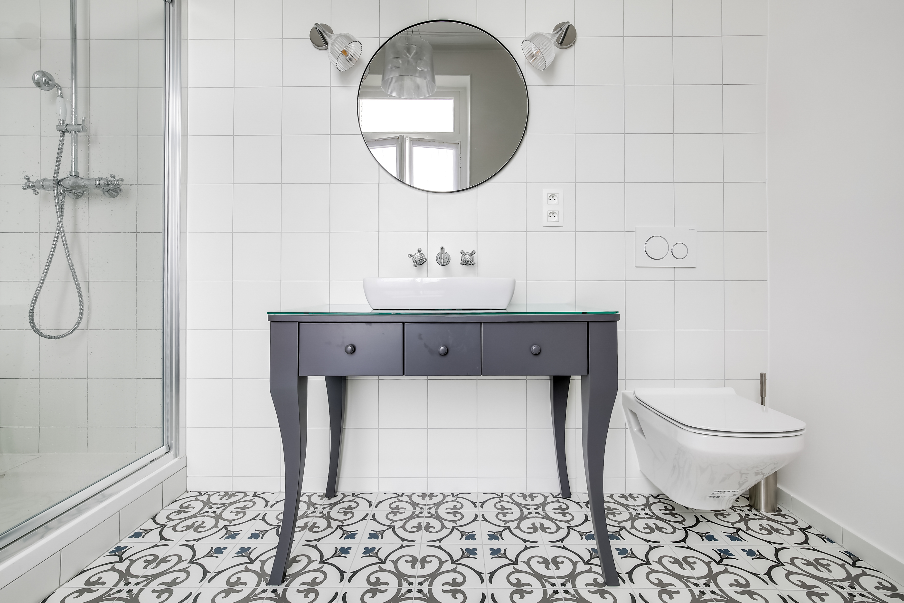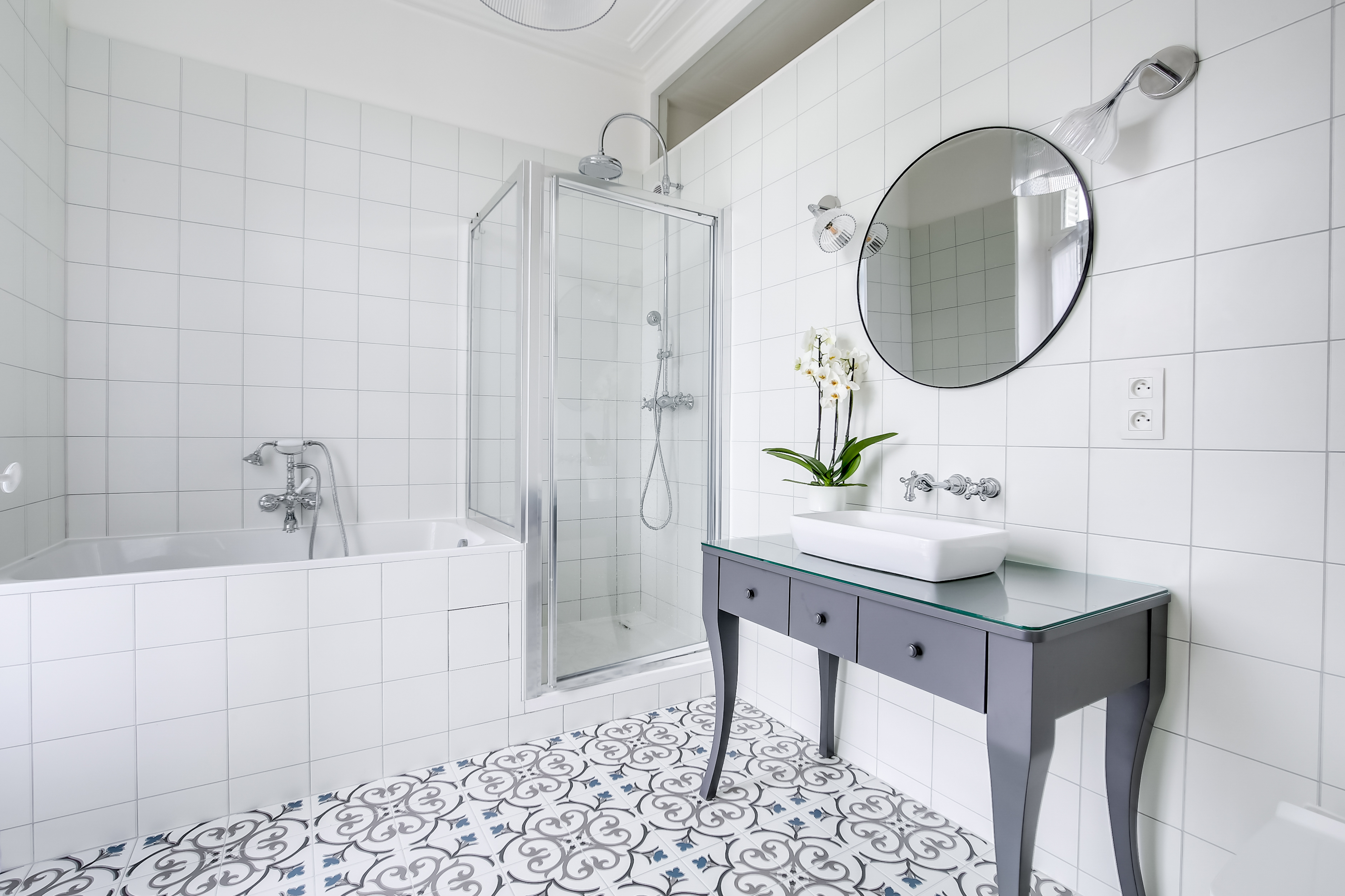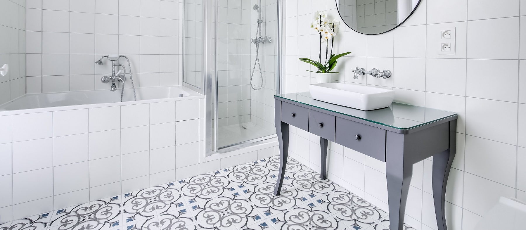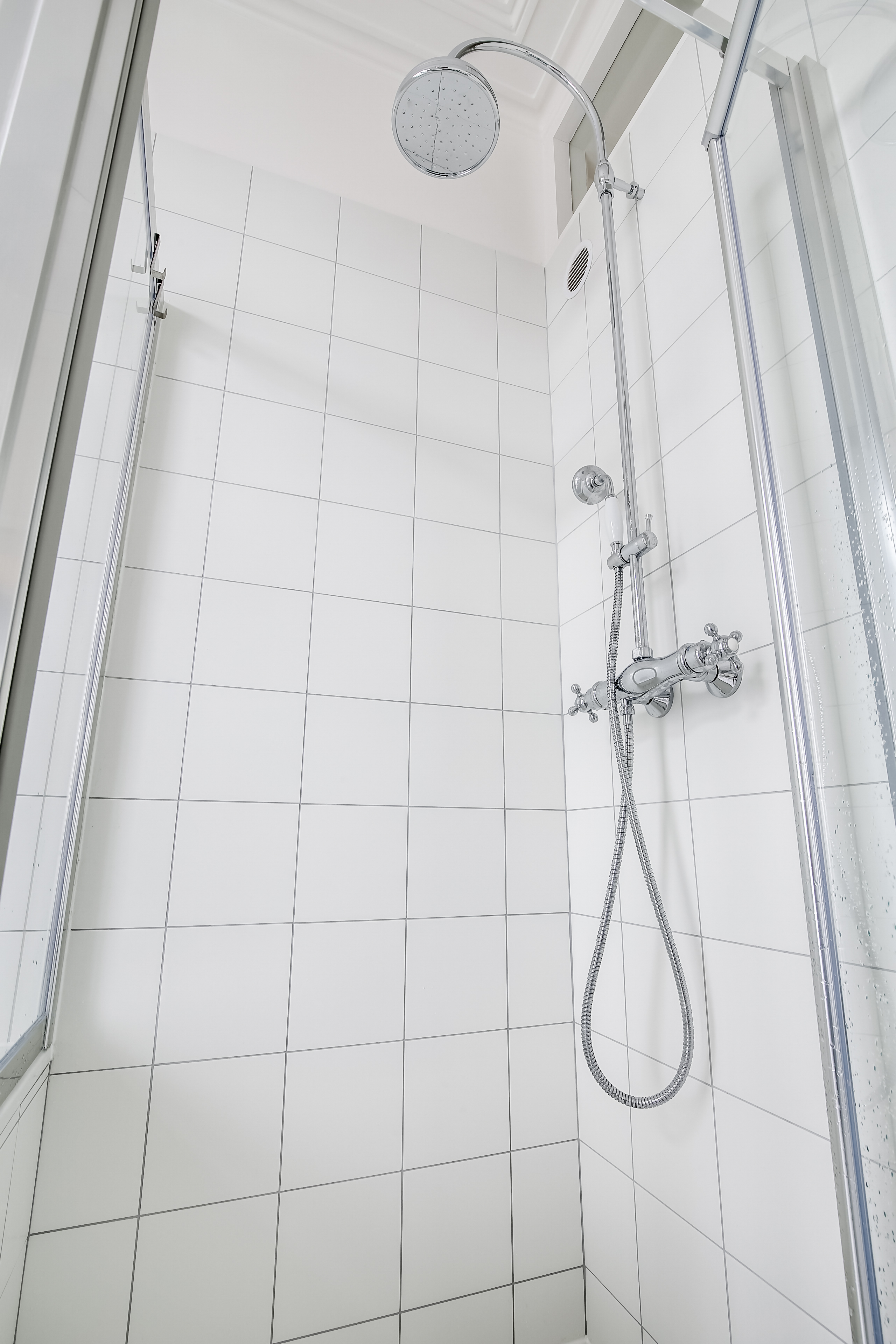 Cette étape a été technique puisque qu’elle fait le lien entre deux éléments. Le rendu des revêtements est dont lié à la qualité du calepinage réalisé. Les carreaux de faïence des murs et du tablier de baignoire sont ainsi parfaitement alignés avec les carreaux en grès cérame du sol. C’est un détail important qui ajoute du cachet à l’atmosphère globale de cette suite parentale.