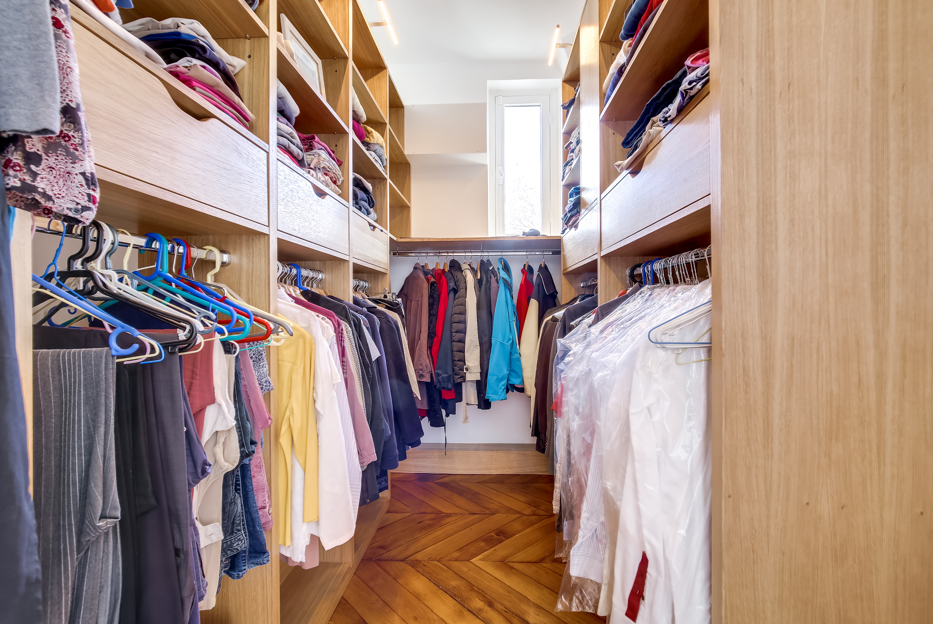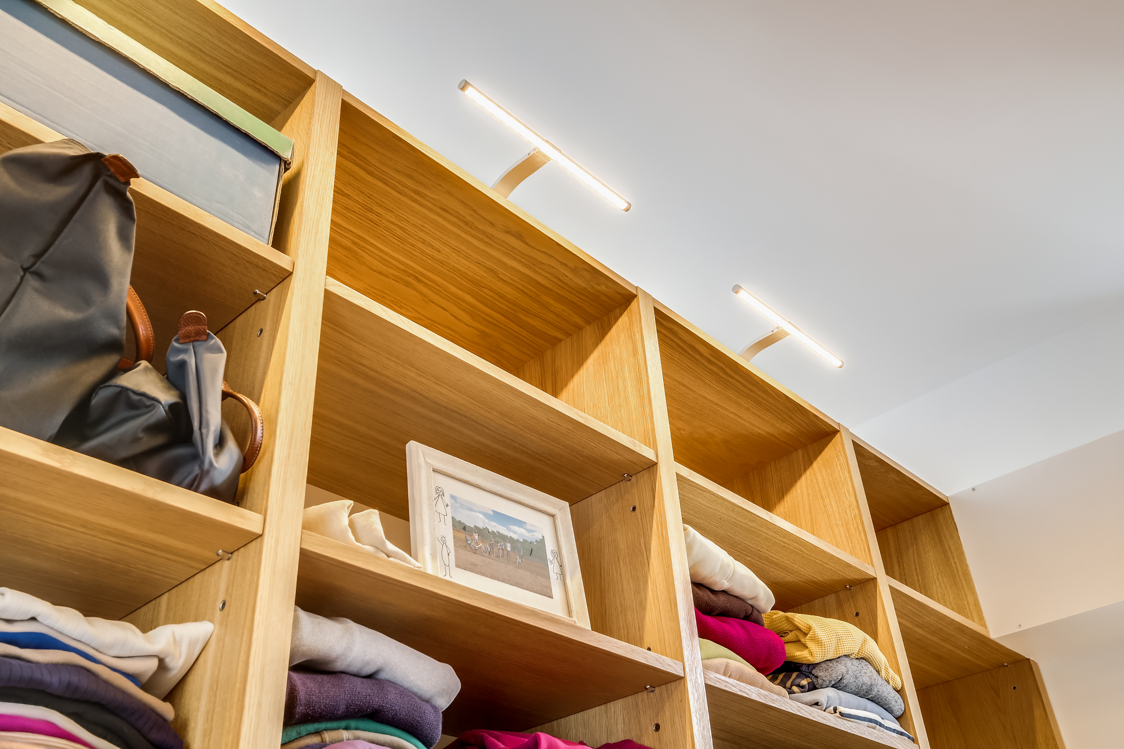 Le chantier de rénovation de la suite parentale a commencé par la dépose des cloisons et du parquet. Après avoir coulé une chape, les cloisons ont ensuite été remontées pour définir les nouveaux espaces. Pour finaliser l’extension de cet appartement familial, nous avons choisi d’apporter de la luminosité dans le dressing. Pour ce, la pose d’un imposte vitré a été inséré en partie haute de la cloison séparative.