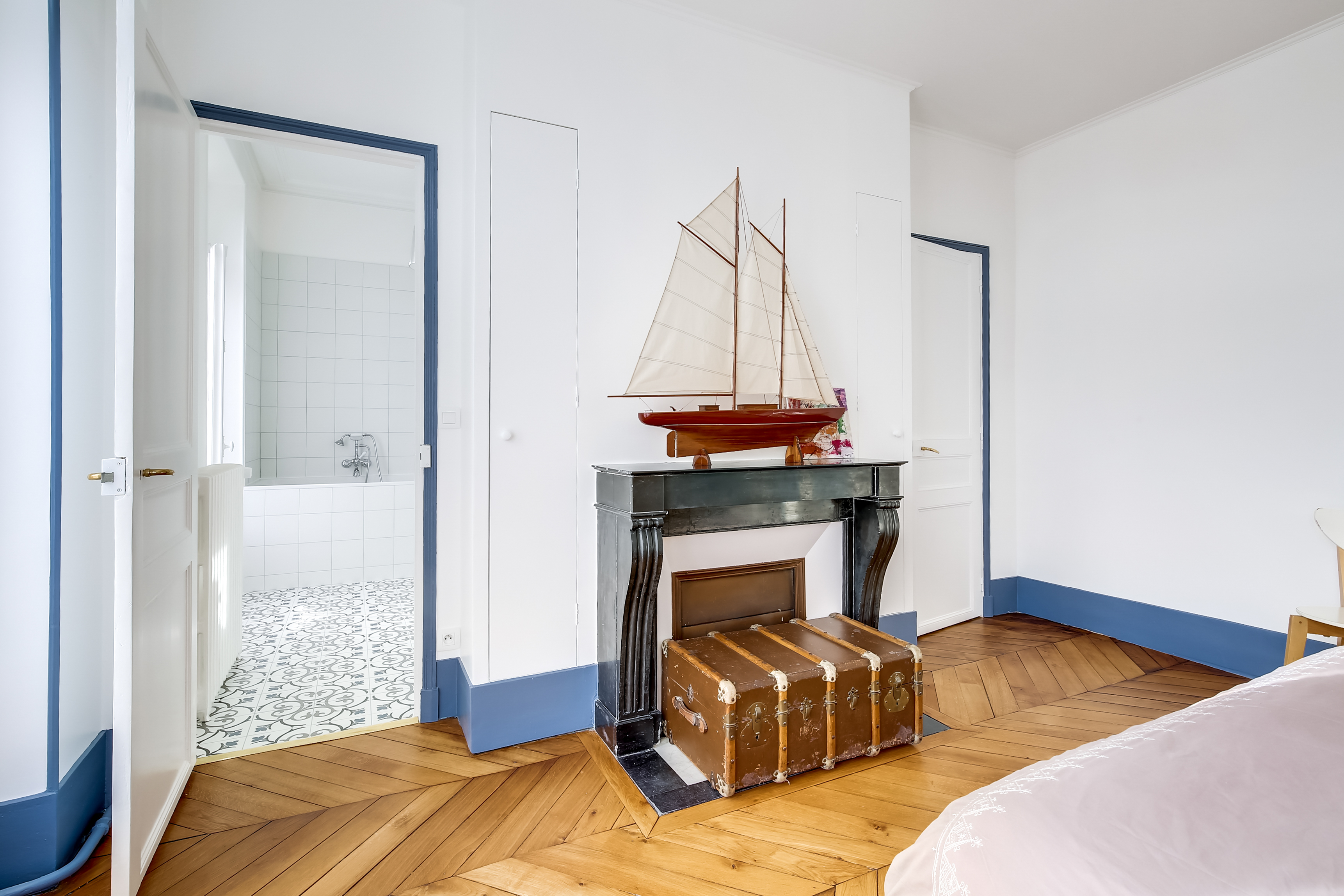 La part belle a été faite à la salle de bains dans la transformation de cette suite parentale du 78. Dotée d’une belle surface elle intègre une baignoire, une douche, un meuble réalisé sur mesure pour accueillir la vasque et des WC suspendus. Le sur-mesure était ici obligatoire pour obtenir le meilleur rendu possible.