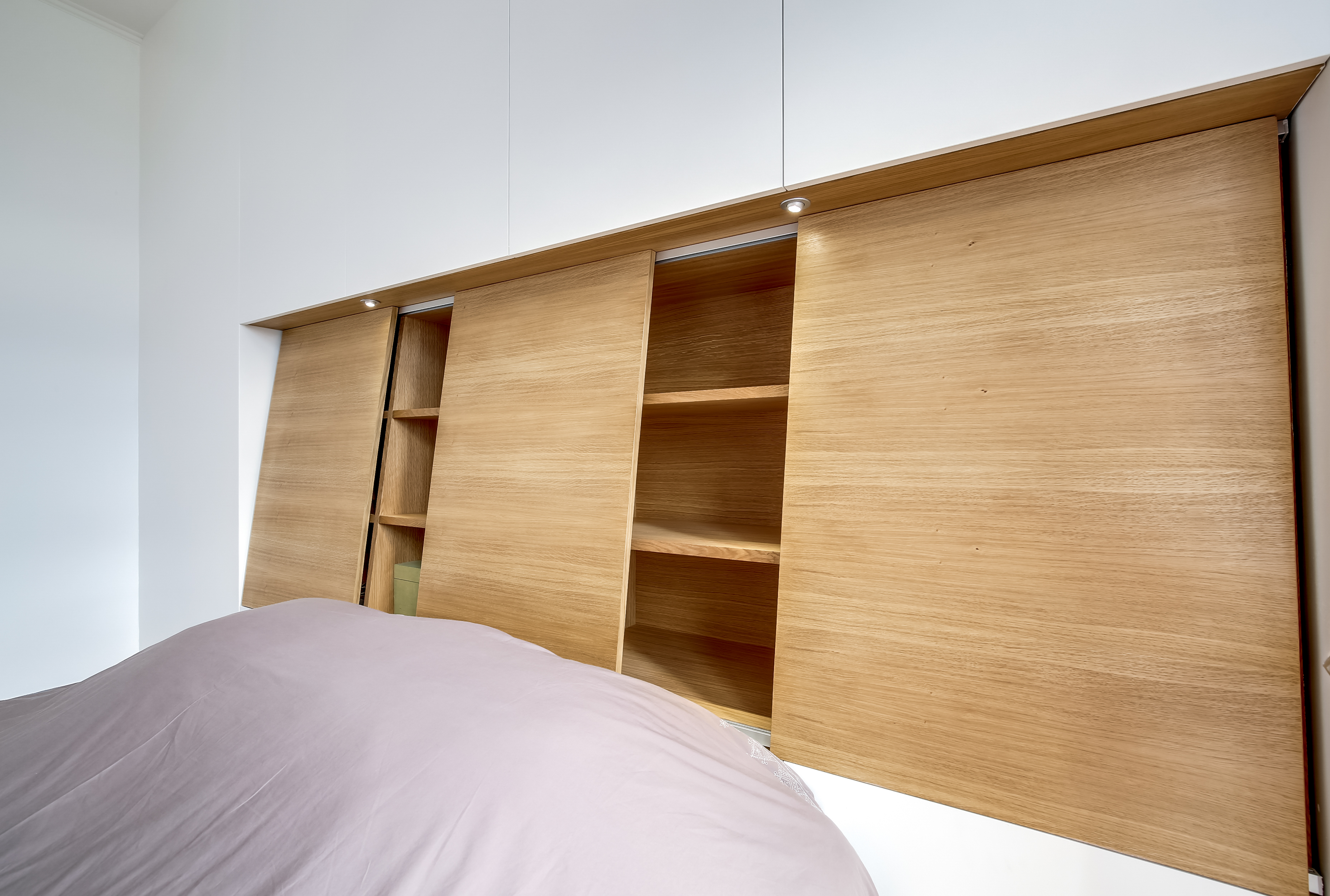 • Une porte d’accès au dressing créée sur mesure afin de reproduire la porte existante d’accès vers la salle de bains. Ainsi une symétrie parfaite est respectée depuis la chambre.